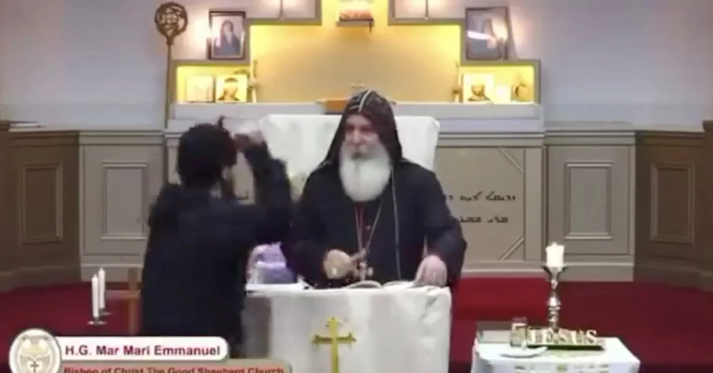 Los videos del incidente que circulan por Internet muestran al obispo de la iglesia, Mar Mari Emmanuel, de pie ante el altar y dirigiéndose a los fieles, mientras otro hombre vestido con un jersey negro se dirige hacia él y lo ataca.
