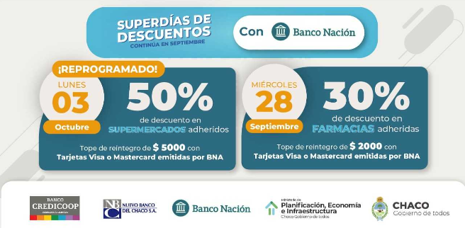 El Ministerio de Planificación, Economía e Infraestructura recordó a usuarias y usuarios que cuenten con tarjetas de crédito Visa o MasterCard emitidas por el Banco Nación que podrán acceder en los próximos días a importantes descuentos en sus compras de medicamentos y alimentos en el marco del programa “Superdías”. El mismo busca fortalecer los ingresos de chaqueñas y chaqueños ante el contexto macroeconómico a nivel nacional.