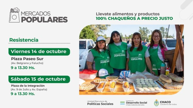Los Mercados Populares se desarrollarán el viernes 14 en Plaza Paseo Sur (Avenida Belgrano y Falucho) y sábado 15 en Plaza de Ia Integración (Avenidas 9 de Julio y España), ambas jornadas de 9.30 a 13.30. En esta oportunidad, la oferta estará centrada en opciones para los festejos y regalos por el Día de la Madre.