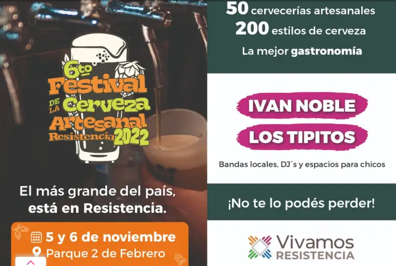 Hoy, con entrada libre y gratuita, arranca la 6ª edición del Festival de la Cerveza Artesanal de Resistencia, en la pista de atletismo del Parque Intercultural 2 de Febrero. El evento inicia a las 18 y a las 21 tocan Los Tipitos, mientras que este domingo las actividades comienzan a las 17 y el show principal será Iván Noble a las 19:45.