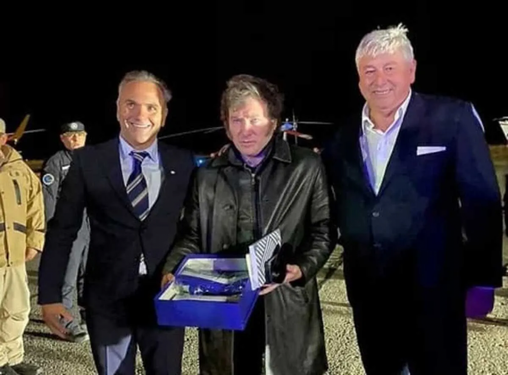 A su arribo, junto a Karina Milei y Manuel Adorni, fue recibido por el intendente Walter Cortés y el ministro de gobierno Federico Lutz y se trasladó en helicóptero hasta el hotel Llao Llao.