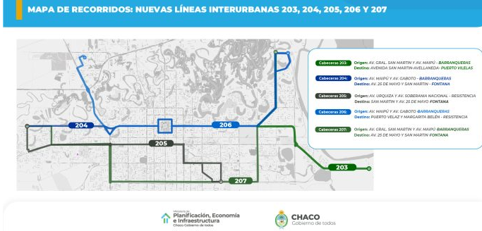 Se trata de las líneas 203, 204, 205, 206 y 207 que conectarán de forma directa Fontana - Barranqueras - Puerto Vilelas, además de incluir nuevos recorridos en las zonas Sur y Norte de Resistencia. Se incrementará 30% los kilómetros recorridos y 20% las y los usuarios del servicio.